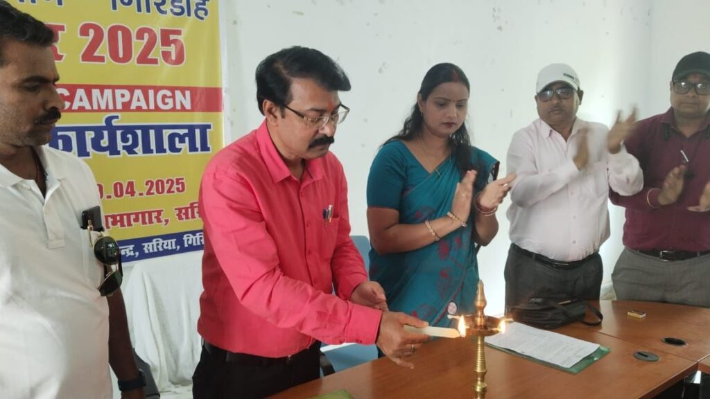 पदाधिकारी ललित नारायण तिवारी प्रखंड शिक्षा प्रसार पदाधिकारी रंजीत कुमार चौधरी, बीपीओ अक्षय कुमार प्रभाकरण, प्रखंड प्रमुख प्रीति कुमारी आदि ने संयुक्त रूप से दीप प्रज्ज्वलित कर किया.इस मौके पर कार्यशाला में उपस्थित शिक्षकों व अन्य प्रतिनिधियों को संबोधित करते हुए अतिथियों ने कहा कि झारखंड शिक्षा परियोजना द्वारा गुरुवार 2025 के तहत आगामी 10 में तक विद्यालय में नए बच्चों का नामांकन करना है इसके लिए विद्यालय के संबंधित शिक्षक एमसी के सदस्य पंचायत प्रतिनिधि अधिका सामूहिक प्रयास आवश्यक है.जिससे कि विद्यालय से दूर रह रहे बच्चे, क्षिजीत बच्चे या अनामांकित बच्चे शिक्षा की मुख्य धारा से जुट सके.अतिथियों ने सभी शिक्षकों को सरकार के द्वारा दिए गए गाइडलाइन के अनुसार भिन्न-भिन्न तारीखों में निर्धारित कार्यक्रम का अनुपालन करने को वही निर्देश दिया कि शिक्षक अपने विद्यालय के पोषक क्षेत्र में डोर टू डोर संपर्क करें और नामांकित बच्चों को विद्यालय से जोड़ें.साथ ही प्रतिदिन नामांकित बच्चों का प्रतिवेदन संबंधित अधिकारी को आवश्यक रूप से दें.बीडीओ ललित नारायण तिवारी,प्रखंड प्रमुख प्रीति कुमारी, सांसद प्रतिनिधि विनोद यादव,विधायक प्रतिनिधि बबलू मंडल,बीईईओ रंजीत कुमार चौधरी, बीपीओ अक्षय कुमार प्रभाकरण,नरेश मंडल,भेखलाल चौधरी, विंध्याचल ओझा वीरेंद्र कुमार पांडेय,मनोज कुमार,अरविंद प्रसाद,नकुल चंद्र सिंह,मेराज अंसारी,प्रकाश पांडेय,भागवत दास,निक्की मिश्रा, गुड़िया कुमारी,संजय सिंह,शिव शंकर रूपांशु रमेश कुमार वर्मा