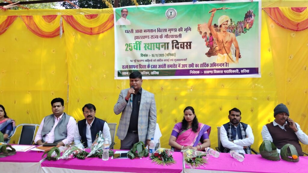 धरती आबा भगवान बिरसा मुंडा की पावन भूमि झारखंड के 25वें स्थापना दिवस के शुभ अवसर पर सरिया प्रखंड कार्यालय में एक भव्य सांस्कृतिक उत्सव का आयोजन किया गया। इस अवसर पर रंगारंग सांस्कृतिक कार्यक्रमों, कर्मचारी सम्मान समारोह और प्रेरक उद्बोधनों ने समारोह को यादगार बना दिया। कार्यक्रम का शुभारंभ दीप प्रज्वलन के साथ हुआ, जिसमें मुख्य अतिथि अनुमंडल पदाधिकारी (एसडीओ) संतोष गुप्ता, विशिष्ट अतिथि प्रखंड विकास पदाधिकारी (बीडीओ) ललित नारायण तिवारी, अंचल अधिकारी संतोष कुमार, थाना प्रभारी आलोक कुमार सिंह, प्रखंड प्रमुख प्रीति कुमारी सहित कई गणमान्य व्यक्तियों ने हिस्सा लिया। समारोह के दौरान अनुमंडल पदाधिकारी संतोष गुप्ता ने प्रखंड के उत्कृष्ट कर्मचारियों को प्रशस्ति पत्र प्रदान कर उनके कार्यों की सराहना की। यह सम्मान कर्मचारियों के समर्पण और कर्तव्यनिष्ठा को प्रोत्साहित करने के उद्देश्य से दिया गया। सम्मानित कर्मचारियों के चेहरों पर गर्व और उत्साह साफ झलक रहा था। अपने संबोधन में अनुमंडल पदाधिकारी संतोष गुप्ता ने कहा कि झारखंड का गठन एक ऐतिहासिक कदम था, जिसने आदिवासी संस्कृति, परंपराओं और प्राकृतिक संपदा को नई पहचान दी।